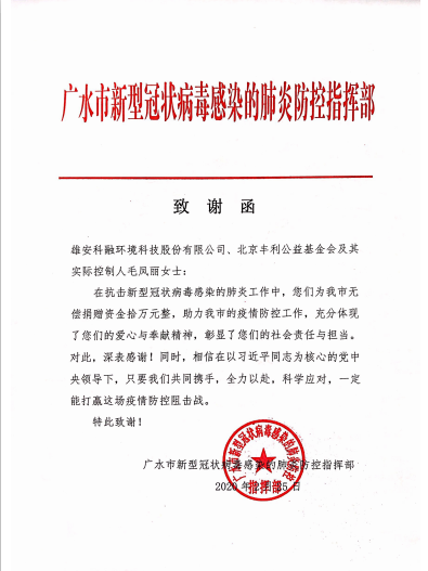 广水市新型冠状病毒感染的肺炎防控指挥部向我司发来致谢函