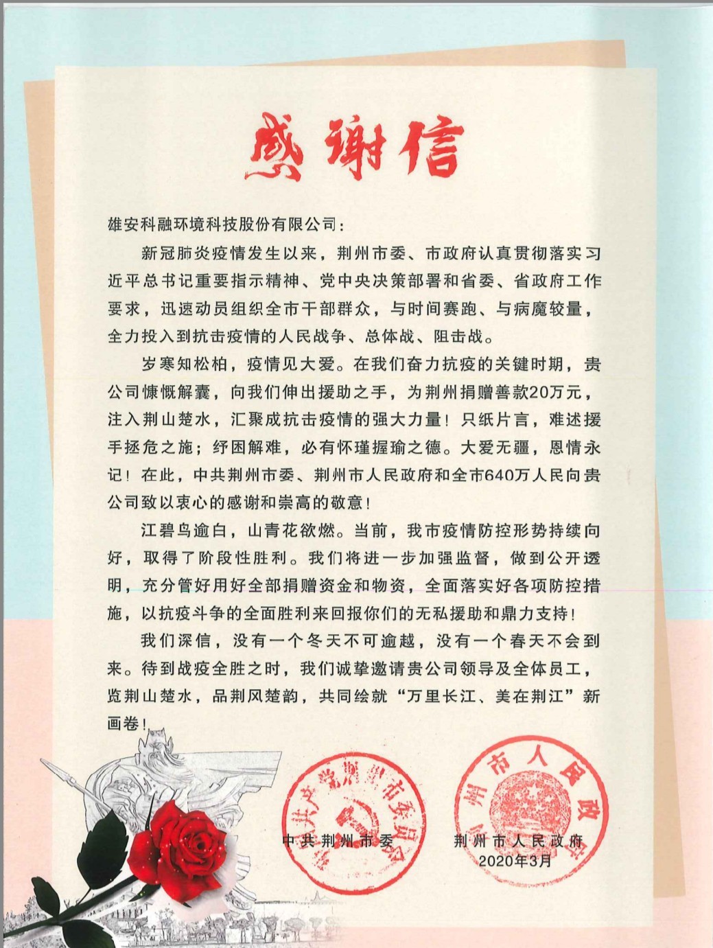 同舟共济,共抗疫情,科融环境向荆州市捐赠善款20万元及大批防疫物资